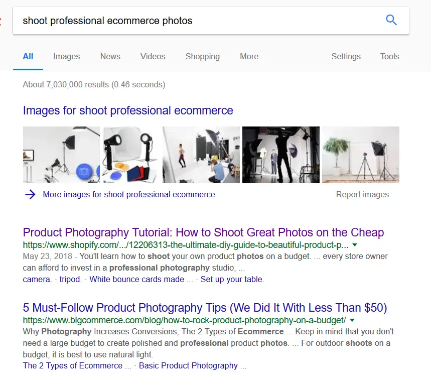 Let’s say one of your audience’s problems was that they have trouble shooting professional images for their e-commerce stores. If you search in Google using a keyword like “shoot professional e-commerce photos,” you will find this:
