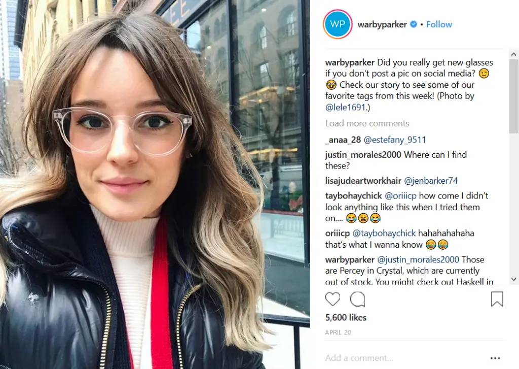 Warby Parker regularly posts UGC that showcases customers who tag the brand in their photos: